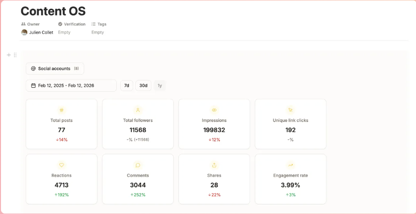 Na publicatie begon het tweede probleem: data verzamelen. Hoeveel impressies heeft de post? Hoeveel likes, shares, comments? Voor elk profiel moest je handmatig LinkedIn induiken. Voor progress updates met klanten kostte het opnieuw tijd om alles bij elkaar te zoeken.