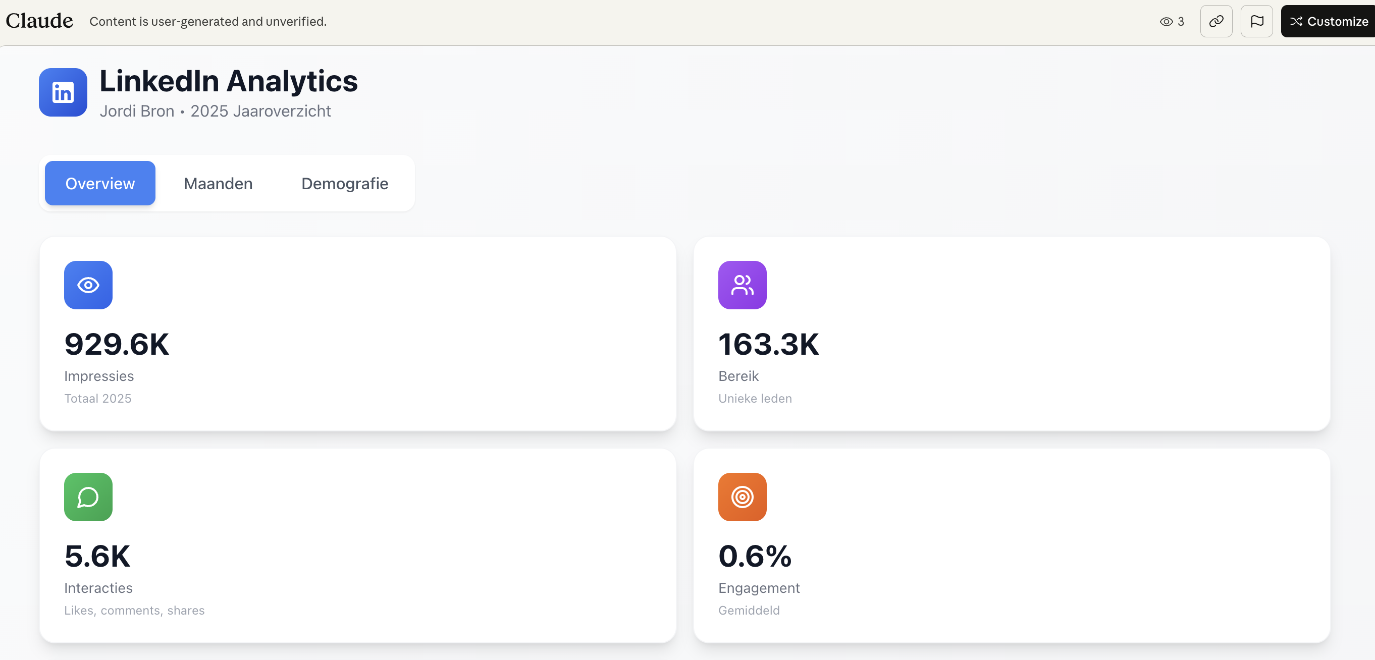 RPW-takeaway: Exporteer je LinkedIn-analytics, upload ze naar Claude en vraag om een visueel overzicht, je hebt binnen vijf minuten meer inzicht dan in de native LinkedIn-interface.